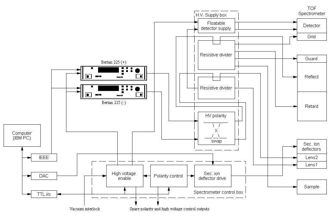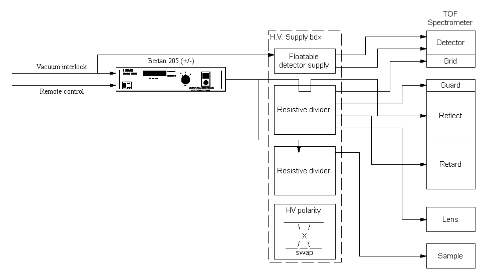 Kore's TOF MS components can be used in a wide range of applications each with potentially very different requirements in terms of the spectrometer power supplies. As well as differences in the spectrometer specification, the supply system may need to be integrated within an overall control system. In order to facilitate the design of such systems Kore offers two rack mounting units: the first draws together control of the spectrometer to a single point and provides the drive for an octopole ion deflector; the second provides floatable excitation for an electron multiplying detector, a series of high voltage tappings for the spectrometer, and a set of high voltage relay contacts to facilitate polarity switching. For a complete power supply system additional general purpose high voltage power supplies are added as required. Such general purpose supplies may be purchased through Kore, or from a third party. The number and specifications of the additional supplies required will depend on the complexity of the experiments that are proposed. A minimal system, with mostly manual control and where lens elements are operated in decelerating mode, can be configured with only a single additional supply. A complex system with extensive computer control might use as many as six additional supplies.