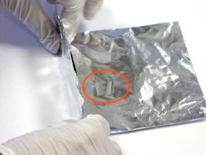 Place the sample (ringed in red) onto clean foil and fold the foil to make a clean envelope.